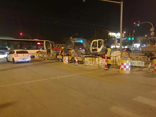 各管線橫穿濟微路的施工過程中,考慮到濟微路為南北交通主干道,本著“少封一米是一米”的施工理念,從減少交通影響,保證車輛和行人通行角度出發,不但將施工全部安排在夜間10點之后,而且經過反復優化施工分區,將原計劃半幅封閉縮小到逐車道封閉的方式進行,早6點高峰來臨前恢復交通。