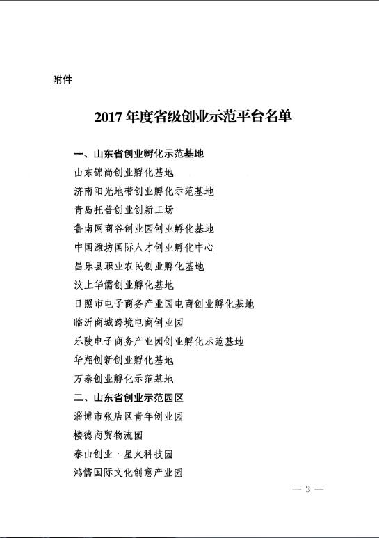 附:山東省人力資源和社會保障廳關(guān)于公布2017年度省級創(chuàng)業(yè)示范平臺名單的通知