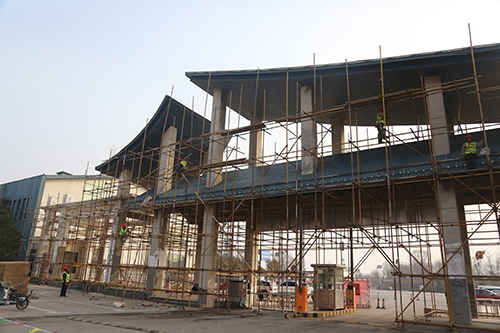 道路廣場及展園維修工程主要以辦公樓、主展館及各展園建筑墻面、地面、防水維修以及園區道路、廣場維修為主。目前,破損墻皮打磨處理約8000平方米,鋼制結構除銹打磨刷漆約4500平方米。由于展園較分散、維修量大,計劃增加施工人員,加快工程施工進度,確保按期完工。
