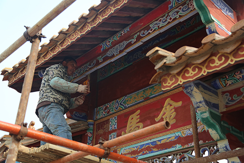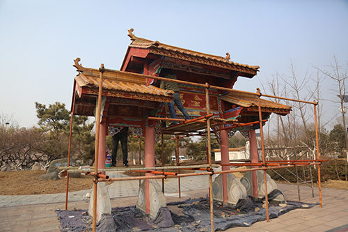 展園內仿古彩繪維修項目主要對原有展園仿古建筑中木作油漆和墻面漆脫落、瓦面破損等部位進行維修,提高建筑觀賞性。共需涂刷油漆775平方米、彩畫1013平方米、更換瓦面490平方米、涂刷乳膠漆940平方米等,目前已涂刷仿古彩繪油漆約1990平方米。