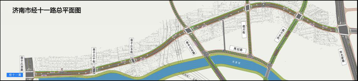 經十一路(南辛莊西路-陽光新路)建設工程位于濟南市槐蔭區,東起陽光新路,西至南辛莊西路,道路規劃紅線寬度為30米,快車道雙向四車道,全長約1967.99米,投資概算1.39億元。主要建設內容包括新建道路、敷設雨污水管線,配套實施給水、燃氣、熱力、弱電、電力等土建工程,同步進行道路綠化、路燈、交通設施等建設。