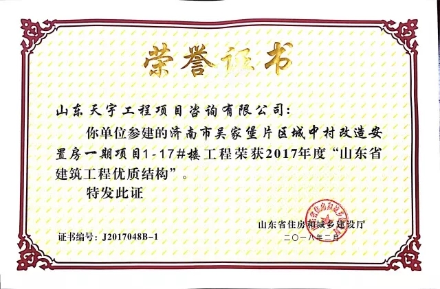 質量是企業的生命。在山東省住房和城鄉建設廳組織的2017年度“山東省建筑工程優質結構”評審中,吳家堡片區安置房一期工程1#到17#樓(共計17棟樓),憑借過硬的質量、完善的管理順利通過專家考評,喜獲“山東省建筑工程優質結構”。“山東省建筑工程優質結構”代表著全省各建筑企業施工質量管理的領先水平,為沖刺山東省建筑工程質量最高榮譽“泰山杯”奠定了基礎。