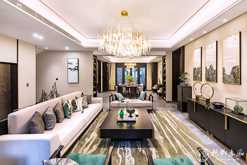 另一套大戶型樣板房采用新中式風格,以儒家思想為依托,通過大理石、金屬銅、木材的有機結合,體現主人的穩重、尊貴和優雅。約110㎡的大面積庭院,演繹著四季不落幕的錦繡風光;挑高約5.7米的地下空間,讓格調生活隨心定制。整套樣板房抒寫著文雅靈動的東方氣韻,展現了“中正和雅”的國風意境。