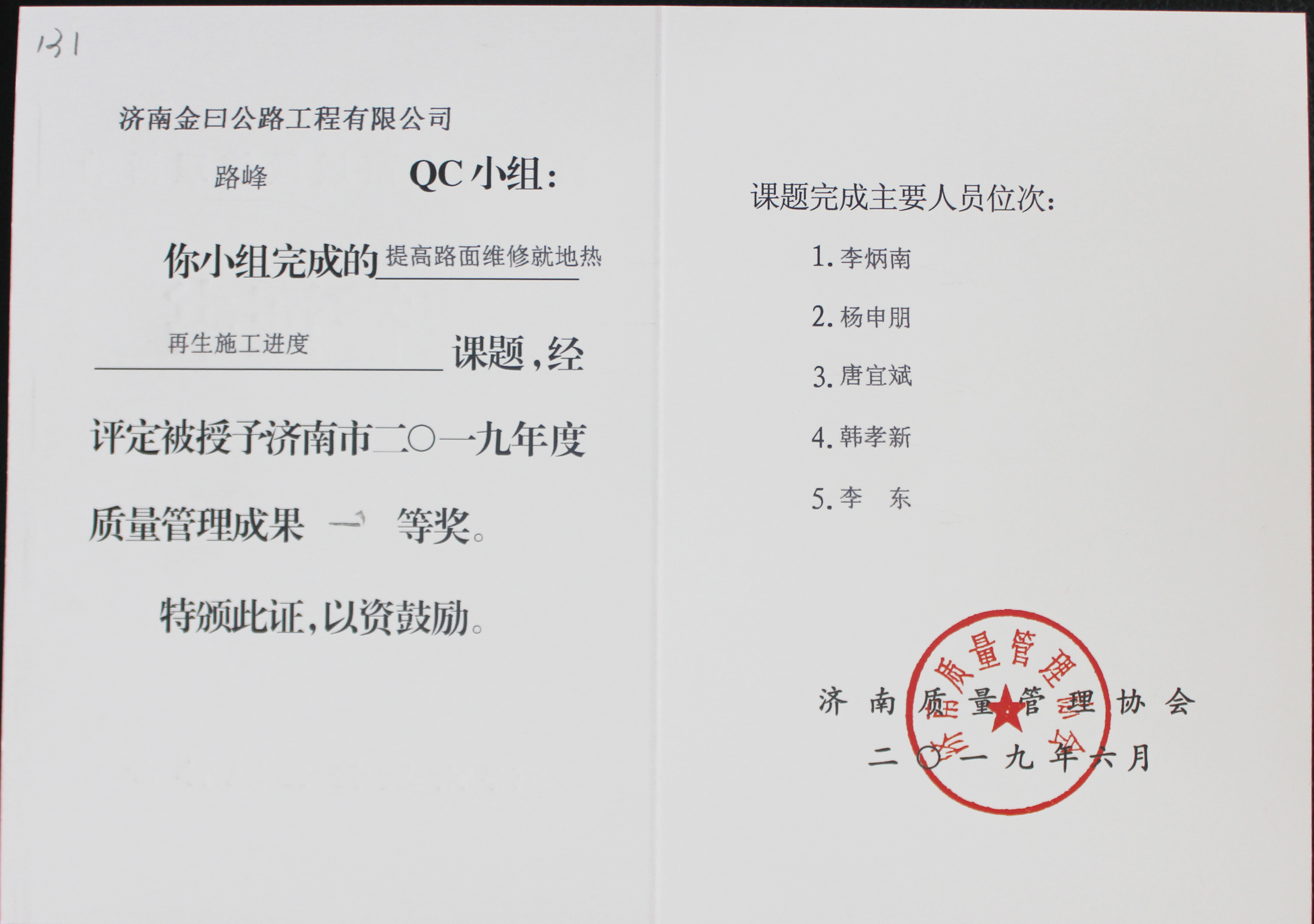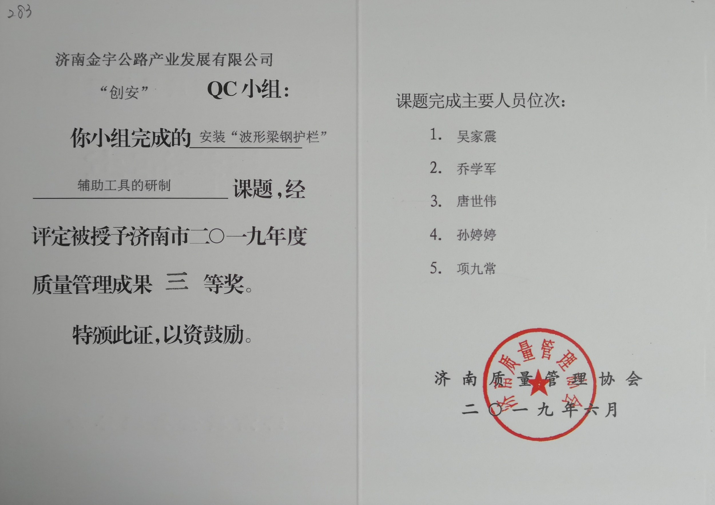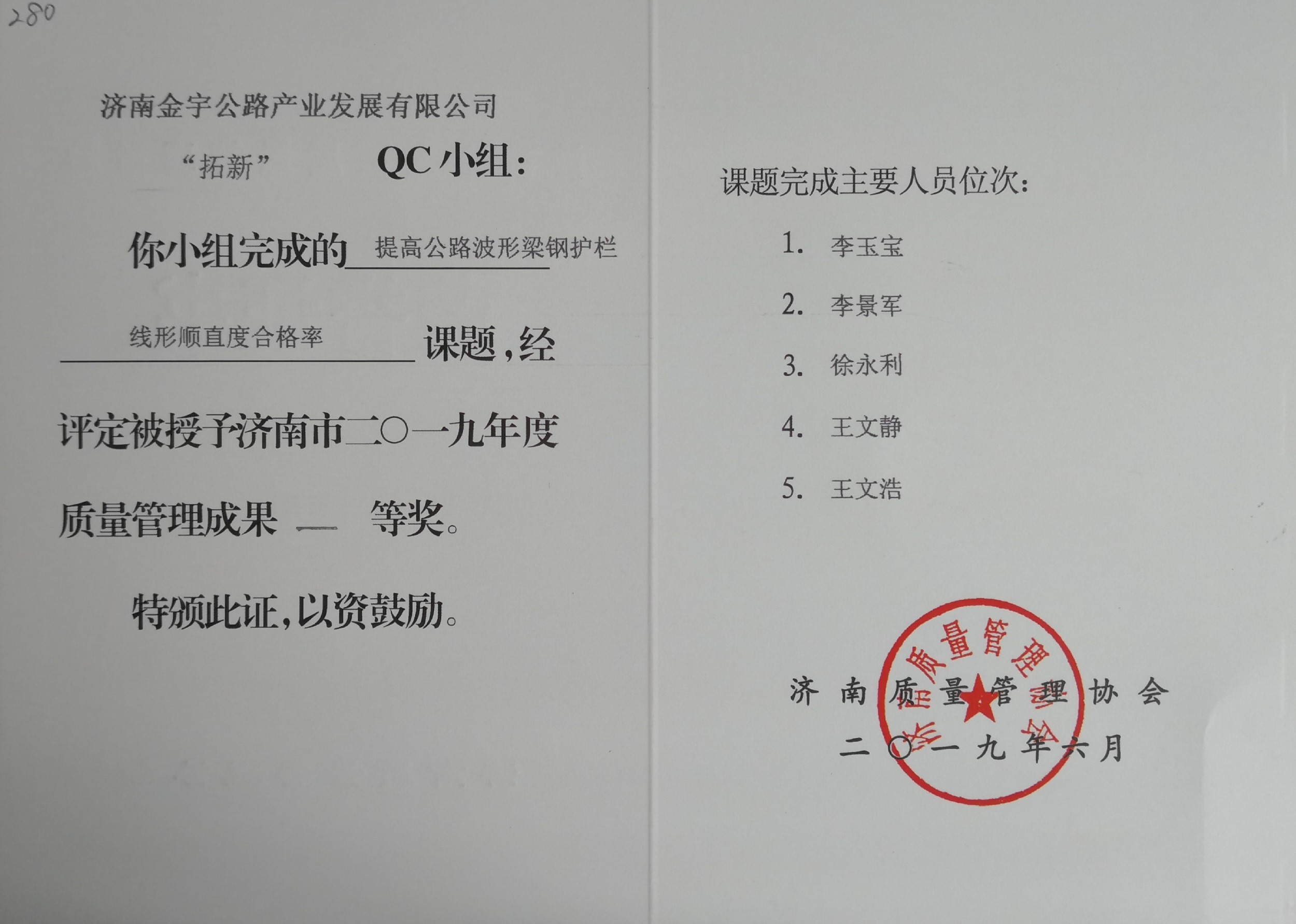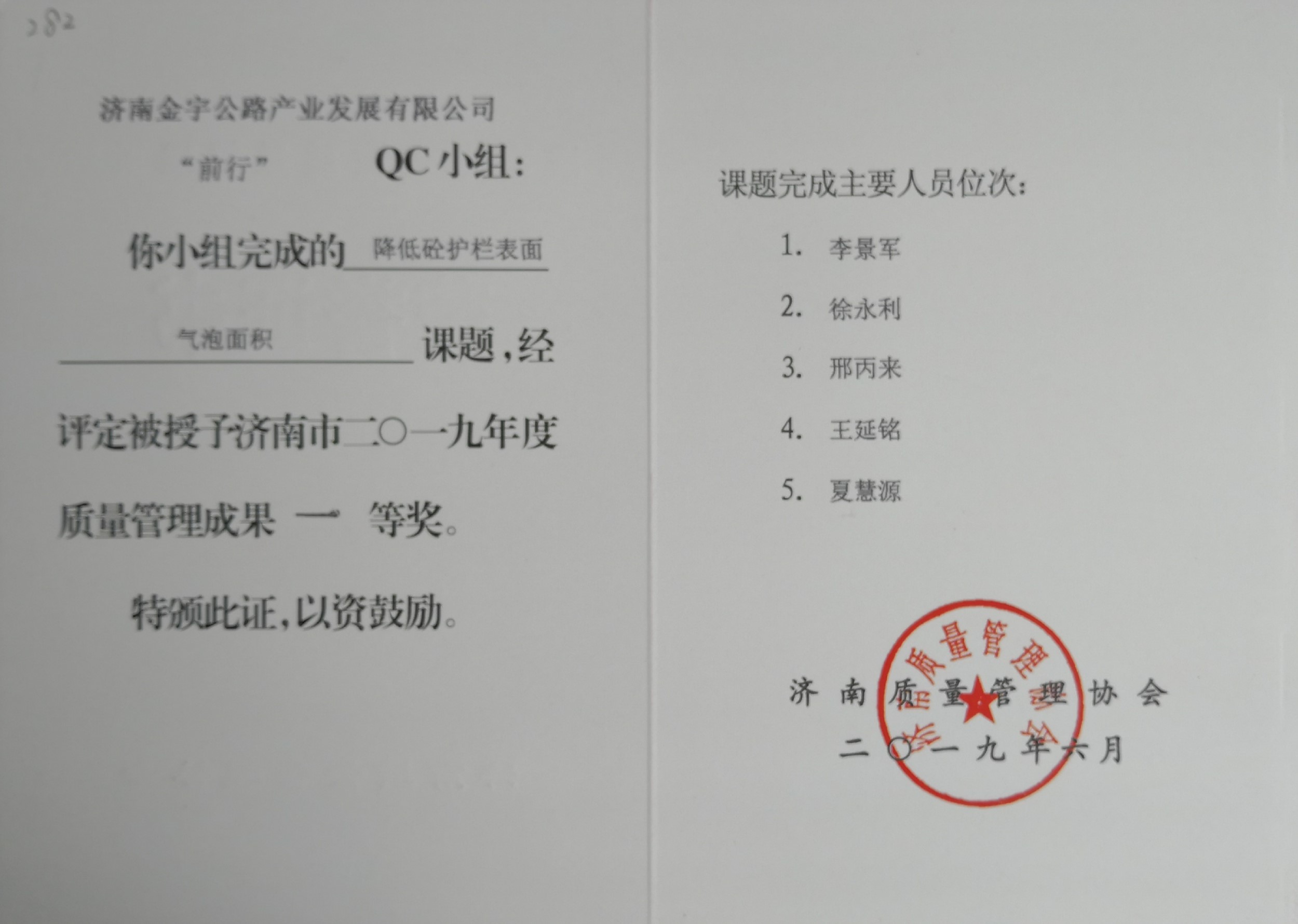 本次交流會(huì)發(fā)布QC成果124項(xiàng),金諾公司申報(bào)的四項(xiàng)QC成果獲得獎(jiǎng)勵(lì),其中《提高國(guó)省道工程附屬邊溝成品提交速度》、《提高預(yù)制箱梁質(zhì)量檢驗(yàn)評(píng)分》兩項(xiàng)課題榮獲“濟(jì)南市2019年質(zhì)量管理成果一等獎(jiǎng)”;《提高瀝青混凝土路面行駛舒適性》一項(xiàng)課題榮獲“濟(jì)南市2019年質(zhì)量管理成果二等獎(jiǎng)”;《提高擋土墻混凝土施工質(zhì)量》一項(xiàng)課題榮獲“濟(jì)南市2019年質(zhì)量管理成果三等獎(jiǎng)”。