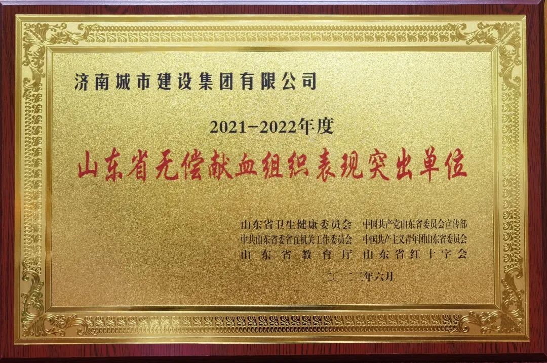 6月14日,值第二十個“世界獻血者日”,山東省衛生健康委在濟南舉行山東省2023年世界獻血者日宣傳活動,對榮獲全國無償獻血表彰和全省無償獻血表揚的集體和個人頒發獎牌和證書,濟南城市建設集團榮獲“山東省無償獻血組織表現突出單位”榮譽稱號。