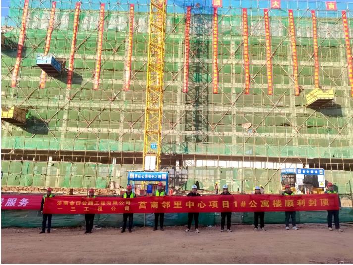鄰里中心項目是臨沂市觀摩項目,涉及鋼結(jié)構(gòu)、鋼筋混凝土結(jié)構(gòu)、幕墻工程、裝飾裝修、安裝工程、電梯工程、ALC墻板工程等多個專業(yè)性較強的領(lǐng)域,工期緊、任務(wù)重,給項目團隊帶來了很大的挑戰(zhàn)。項目部周密策劃組織施工,積極落實質(zhì)量安全交底,統(tǒng)籌調(diào)配人材機配置與進場,鉚足干勁、團結(jié)協(xié)作,每天召開例會各個擊破現(xiàn)場問題,不斷提高施工效率、質(zhì)量。12月15日,項目公寓樓順利封頂,標志著項目建設(shè)取得階段性勝利。