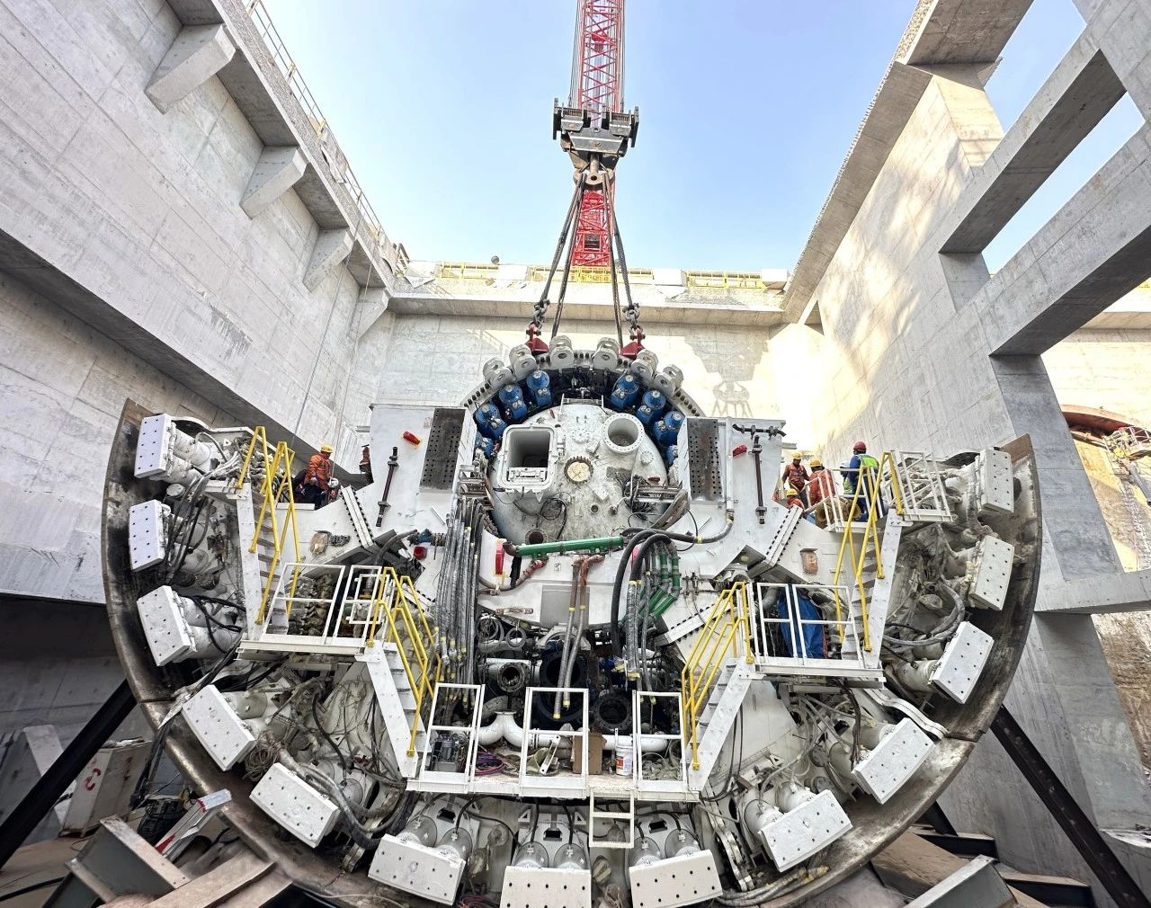為了確保主驅動順利下井,項目團隊科學部署、超前謀劃,多次研究施工現(xiàn)場,詳細制定主驅動吊裝下井方案,確保周圍環(huán)境符合施工要求。當天上午,隨著指令下達,800噸履帶吊將主驅動平穩(wěn)吊起,在空中經(jīng)歷了起吊、翻身、旋轉等一系列高難度動作后,經(jīng)過現(xiàn)場一點點調整方位后,緩緩送入始發(fā)井內,成功與井下盾體結合。