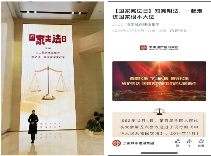 活動期間,集團(tuán)在一樓大廳電子屏投放自行設(shè)計的國家憲法日宣傳海報,營造濃厚活動氛圍,并在微信公眾號開設(shè)“法治宣傳教育”欄目,推送《【國家憲法日】知憲明法,一起走進(jìn)國家根本大法》《憲法宣傳周│習(xí)近平法治思想知識問答(上)》《憲法宣傳周│習(xí)近平法治思想知識問答(下)》《憲法宣傳周│新《公司法》知識問答(上)》《憲法宣傳周│新《公司法》知識問答(下)》共計5篇普法推文。同時,集團(tuán)廣泛動員各子公司靈活采用線上、線下相結(jié)合的普法形式,大力弘揚憲法精神,營造尊法守法護(hù)法的企業(yè)氛圍,引導(dǎo)廣大干部職工自覺做習(xí)近平法治思想的傳播者、踐行者。